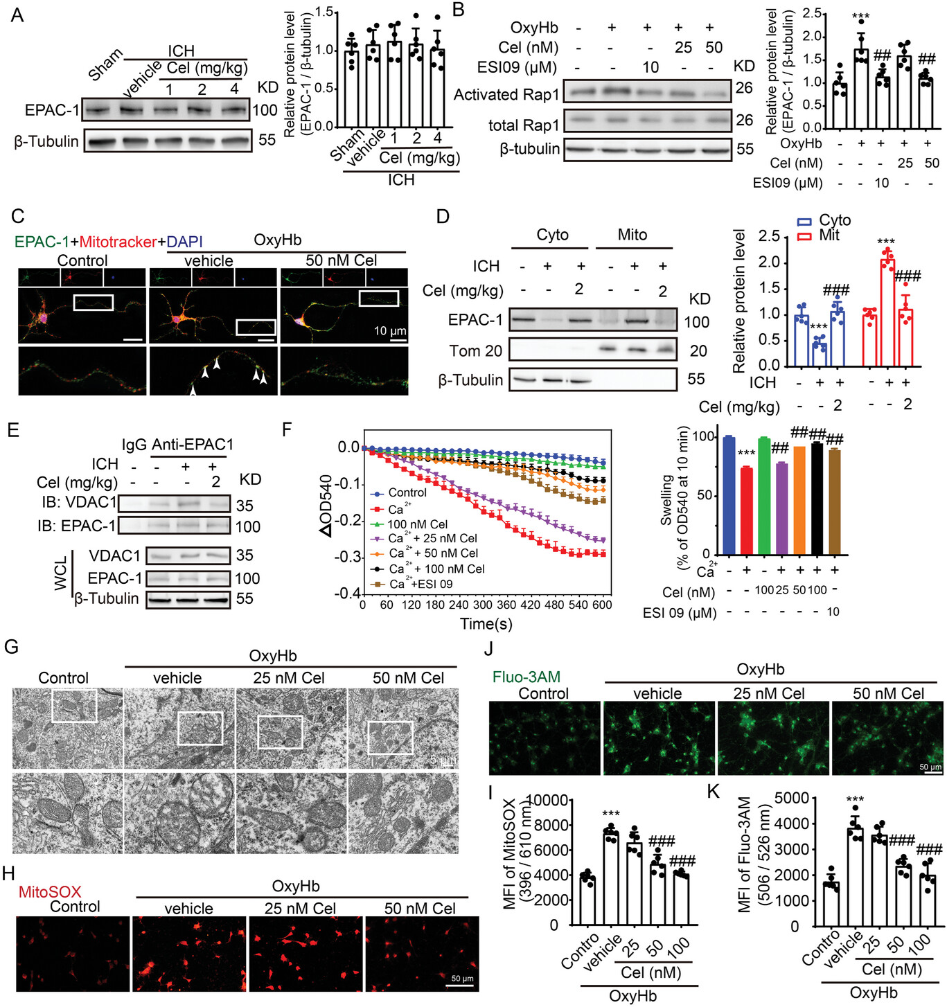 A) Samples of cortex surrounding the hematoma in mice were collected 48 h after ICH induction and treatment with 1, 2, and 4 mg k−1g celastrol. EPAC-1 protein levels were detected by western blot. β-Tubulin served as loading controls, with a sham group being normalized to a value of 1 for accurate comparisons, n = 6. B) After being stimulated with OxyHb, the neurons were treated with the EPAC-1 inhibitor ESI09 (10 µm) or celastrol at concentrations of 25 and 50 nm. The activation levels of Rap1-GTP were measured using a Rap1 Activation Assay Kit. β-Tubulin served as loading controls, with each sham group being normalized to a value of 1 for accurate comparisons, n = 6. C) Following stimulation with OxyHb, the neurons were treated with 50 nm celastrol. Immunofluorescence analysis was performed using an anti-EPAC-1 antibody (green) to label neurons and mitotracker staining for mitochondria (red). Nuclei were counterstained with DAPI (blue). Representative images from triplicate experiments are presented, showing co-localization of celastrol and mitochondria in the proximal neurite, as indicated by arrows. Scale bar: 10 µm. D) The protein levels of EPAC-1 in the mitochondria and cytoplasm were evaluated by western blot analysis across different groups. The mean value of each protein in the control group was normalized to 1.0, with β-tubulin and Tom 20 serving as the loading control, n = 6. E) Co-immunoprecipitation was used to detect the interaction between EPAC-1 and VDAC-1. F) Mitochondria were pretreated with celastrol or ESI09 for 30 min, followed by exposure to Ca2+ for another 10 min. Mitochondria swelling traces were recorded based on the absorbance at 540 nm. The mitochondrial swelling was quantified, n = 6. The neurons were stimulated with 10 µm OxyHb for 12 h and subsequently exposed to varying doses of celastrol treatment for 24 h. Afterward, the cells were collected for assessment of mitochondrial function. G) Mitochondrial structures in neurons, with or without celastrol treatment following OxyHb stimulation, were observed using transmission electron microscopy. The scale bar was set at 5 µm. H) Neurons from various experimental groups were subjected to MitoSOX staining and subsequently visualized under a Nikon fluorescence microscope. I) Neurons from various experimental groups were subjected to MitoSOX staining, and the fluorescence intensity was quantified using a fluorescent microplate reader with excitation/emission wavelengths of 396/610 nm, n = 6. J) The Fluo3-AM staining was used to detect calcium in the cytoplasm of neurons, which was subsequently visualized using a Nikon fluorescence microscope. K) The fluorescence intensity of Fluo3-AM was measured using a fluorescent microplate reader with excitation and emission wavelengths set at 506 and 526 nm, respectively, n = 6. All data are presented as mean ± SD. Statistical significance was determined using one-or two-way ANOVA with Tukey’s multiple comparisons tests (*p < 0.05, **p < 0.001, ***p < 0.0001 vs control group; #p < 0.05, ##p < 0.001, ###p < 0.0001 vs vehicle group).