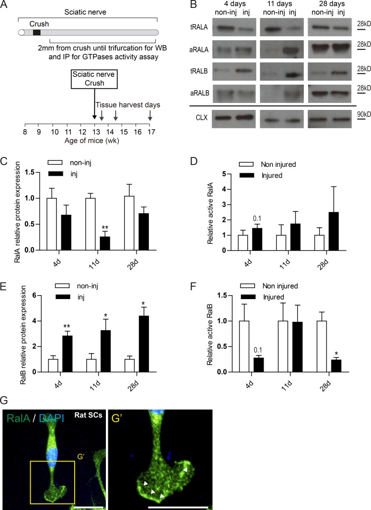 (A) Schematic representation of the sciatic nerve crush model used to assess the role of RalGTPases on nerve repair. (B) Western blot of injured (inj) and noninjured (non-inj) sciatic nerves 4, 11, and 28 d after sciatic nerve crush in WT mice probed with antibodies against RalA and RalB. Calnexin (CAL) used as loading control. Immunoprecipitation blot of activated forms of RalA and RalB. (C–F) Quantification of the relative protein expression of RalA (C) and RalB (E) across the time points analyzed in the Western blots. Quantification of the relative protein expression of active RalA (D) and active RalB (F) across the time points. Data are presented as fold change against noninjured relative expression (**, P < 0.01; *, P < 0.05; Student’s t test), n = 4 or 5. Data are presented as mean ± SEM. (G) Primary cultures of rat SCs demonstrate expression of endogenous RalA (green) in the nucleus, perinuclear cytoplasm, and in the plasma membrane. (G’) High magnification picture shows an enrichment of RalA in the membrane edge of lamellipodia (arrow bars). Scale bars, 50 µm.