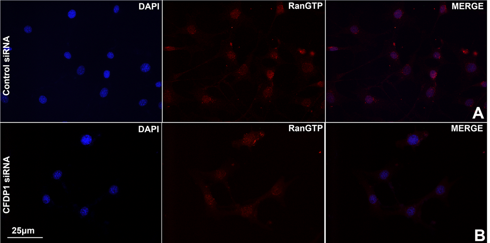 Representative immunofluorescence images comparing RanGTP levels in control and CFDP1 siRNA-treated NIH3T3 cells.