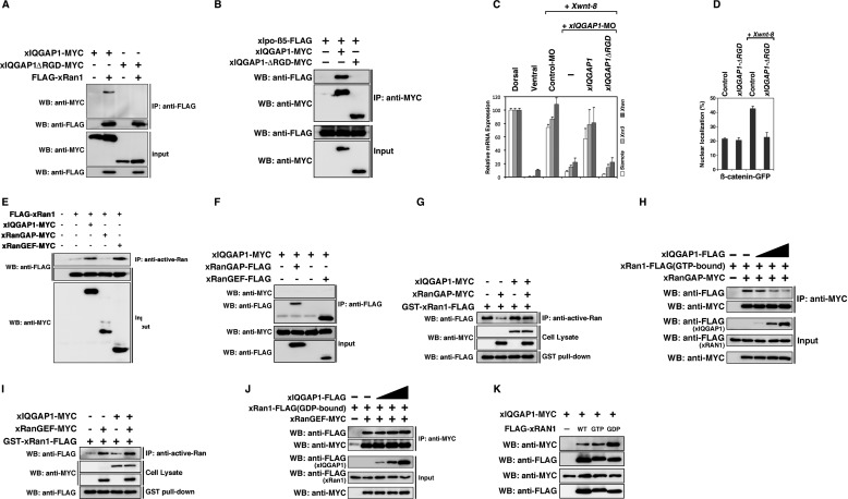 GST-xRan1-FLAG was expressed in Escherichia coli BL21 (DE3). Bacteria were lysed with GST lysis buffer (PBS with 1% Triton X-100, 1 mm DTT, and Complete protease inhibitor cocktail (Roche Applied Science)). GST fusion proteins were purified by affinity chromatography with glutathione-Sepharose 4B (GE Healthcare) and eluted with 50 mm Tris-HCl (pH 8.0) and 20 mm glutathione. Purified proteins were mixed in TNE buffer (10 mm Tris-HCl (pH 7.8), 0.1% Nonidet P-40, 150 mm NaCl, 1 mm EDTA, 1 mm DTT, 10% glycerol, and Complete protease inhibitor cocktail (Roche Applied Science)). The protein solutions were added to glutathione-Sepharose 4B (GE Healthcare) and incubated for 2 h at 4 °C. The GAP or GEF activity toward xRan1 was examined by the Western blotting of immunoprecipitates with the anti-active-Ran antibody. Each reaction performed in 50 μl of buffer A (50 mm HEPES, pH 7.4, 1.5 mm magnesium chloride, 5 mm EGTA, 1 mm DTT, 1 mm ATP, and Complete protease inhibitor cocktail (Roche Applied Science)) with the addition of 1 μl of cell lysate. Cell lysates were prepared from HEK 293T cells transfected with xIQGAP1-MYC, xRanGAP-MYC, xRanGEF-MYC, or pCS2+, using buffer B (buffer A + 150 mm sodium chloride, 10% glycerol, 1% Triton X-100, 60 mm magnesium chloride). Reactions were incubated at room temperature for 5 min and terminated by adding 250 μl of buffer B. We performed immunoprecipitation with the same tubes for 30 min. For GAP assays, GST-xRan1-FLAG was preloaded with GTP (1 mm) for 10 min at room temperature. For GEF assays, we added 0.1 mm GTP and 0.1 mm GDP in reactions.