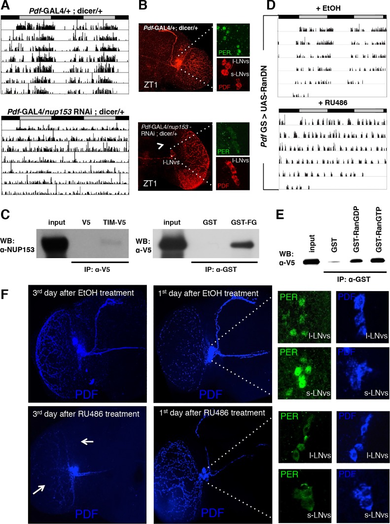 (D) Expression of a dominant negative form of Ran (RanDN) in PDF+ cells during adulthoods leads to arrhythmia in DD. RanDN was expressed under control of an RU486-inducible Pdf-GS driver. Flies were fed either 500 mM RU486 or ethanol (EtOH, vehicle control) from the time of entrainment. (E) GST pulldown experiments detect interactions between TIM expressed in S2 cells and purified GST-RAN fusion proteins. RAN was tested in GDP-bound (RanGDP) and GTP-bound (RanGTP) forms. GST alone served as a control. The bound protein was analyzed with an anti-V5 antibody. In five independent experiments we have confirmed that TIM shows slight preference (1.64 ± 0.18) for Ran GTP over Ran GDP. (F) Expression of RanDN in central clock cells leads to severe morphological defects (white arrow) on the 3rd day after RU486 treatment. On the 1st day after RU486 treatment, morphological effects were not visible and PER (green) was cytoplasmic in both l-LNvs and s-LNvs at ZT1.