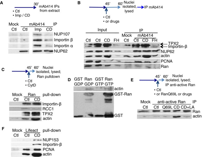 - Scheme: Nuclei, formed in control extract, supplemented at 45 min with RanQ69L, CytD (CD), without or with latrunculin A (LA), were lysed and immunoprecipitated with anti‐active Ran antibodies (Mock IP, no antibody added). Beads were blotted for actin and Ran.