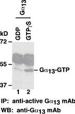 Purified Gα13 proteins were treated with GDP (lane 1) or GTPGTPγS (lane 2). After immunoprecipitation with anti-active Gα13-GTP mouse monoclonal antibody (Cat. # 26902), these proteins were separated by SDS/PAGE and western blotted with anti- Gα13 mouse monoclonal antibody (Cat. # 26004). |