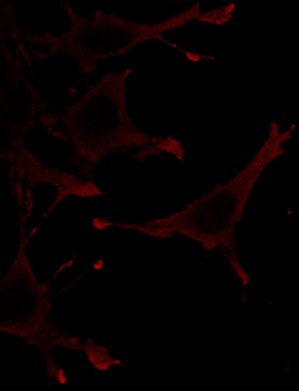 Staining of MEF cells (treated with PDGF) with anti- Gα13-GTP monoclonal antibody showing the localization of Gα13-GTP in the leading edge of migrating cells. |