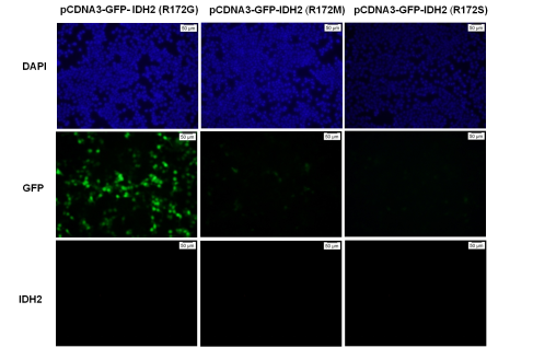 HEK293T cells were transfected with pCDNA3-GFP- IDH2(R172K) plasmid , pCDNA3-GFP- IDH2 (WT) plasmid, pCDNA3-GFP- IDH2 (R172H) plasmid , pCDNA3-GFP- IDH2 (R172W) plasmid, pCDNA3-GFP- IDH2 (R172G) plasmid,pCDNA3-GFP- IDH2 (R172M) plasmid or pCDNA3-GFP- IDH2 (R172S) plasmid, then fixed and stained with anti- IDH2(R172K) monoclonal antibody (Cat. #26163).