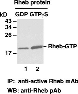 Purified Rheb proteins were immunoprecipitated after treated with GDP (lane 1) or GTPγS (lane 2). Immunoprecipitation was done with the anti-Rheb-GTP monoclonal antibody (Cat. No. 26910). Immunoblot was with an anti-Rheb rabbit polyclonal antibody (Cat. No. 21098). |